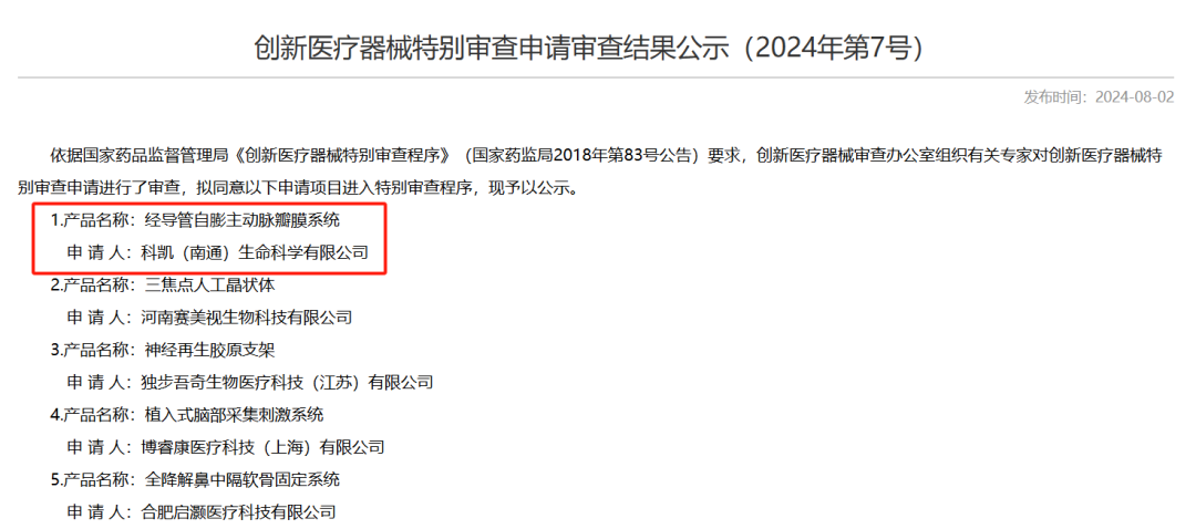 近日,国家药品监督管理局医疗器械技术审评中心发布了《创新医疗器械特别审查申请审查结果公示(2024年第7号)》,其中,科凯(南通)生命科学有限公司(简称:“科凯生命科学”)自主研发的经导管自膨主动脉瓣膜系统已通过审核,进入创新医疗器械特别审查“绿色通道”。